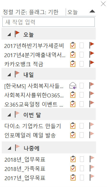 할 일 모음 창은 플래그(깃발) 기능과 함께 이용함으로써 그 효과가 배가됩니다. 받은 편지함에 특정 시기까지 처리해야 할 이메일이 있다면 플래그를 꽂아보세요. 그러면 플래그를 꽂은 이메일이 할 일 모음 창 작업 목록에 나타나게 됩니다. 해당 업무를 처리한 후 플래그를 완료 처리함으로써 특정 스케줄을 놓치지 않고 제때 처리할 수 있습니다.