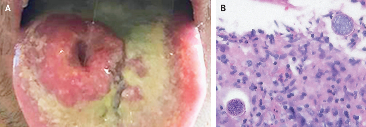 A 34-year-old man with a history of human immunodeficiency virus (HIV) infection presented to the emergency department with a 1-week history of headache, fever, and confusion. On physical examination, a large, ulcerative lesion was noted on his tongue (Panel A). The patient's CD4 count was 39 cells per cubic millimeter (reference range, 500 to 1450), and his HIV viral load was 197,000 copies per milliliter. A chest radiograph showed patchy infiltrates in both lungs. A biopsy specimen of the tongue lesion was obtained (Panel B). What is the most likely diagnosis?
