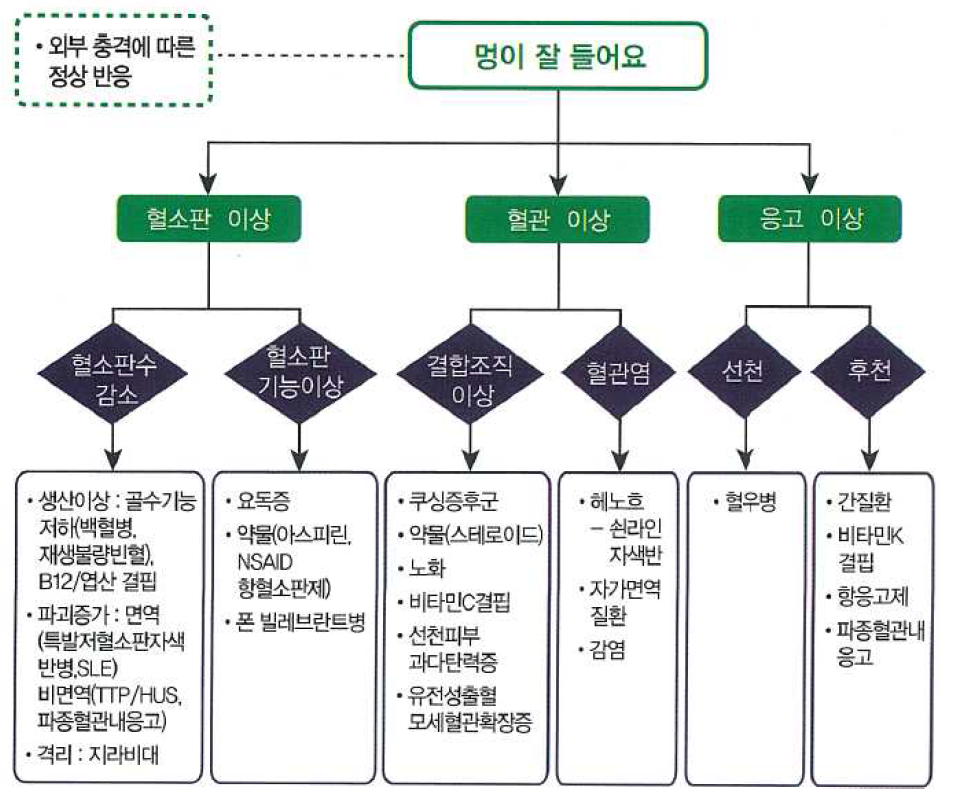 - 동반된 자발 출혈 : 코피 / 잇몸출혈 / 과다 월경 / 직장 출혈