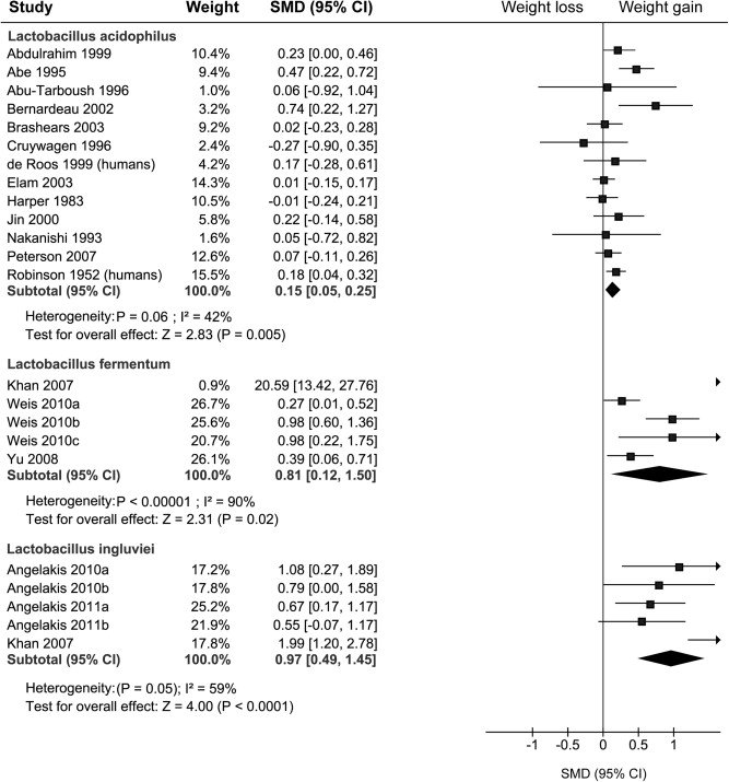 Both L. rhamnosus and L. gasseri also significantly lowered weight in mice [34, 35, 36], while L. gasseri also reduced body weight in rats [37].