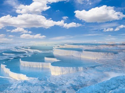 많은 여행객들에게 사랑 받는 여행지인 온천, 그 중에서도 터키 남부 데니즐리주에 있는 고대 도시 유적으로 경이로운 경관을 자랑하는 파묵칼레 온천이 단연 인기다. 터키어로 ‘목화의 성’을 뜻하는 이곳은 석회 성분이 다량으로 함유된 온천수가 수 세기 동안 바위 위를 흐르며 표면을 탄산칼슘 결정체로 뒤덮어 마치 하얀 목화로 만든 성을 연상시켜 붙여진 이름이다. 경사면을 흐르는 온천수가 장관을 이루는 파묵칼레는 푸르던 물이 희게 변색되고, 해 질 녘에는 붉은빛을 띠며 하루에도 여러 차례 색이 바뀐다. 1988년 유네스코 세계유산으로 지정된 이곳의 온천수는 섭씨 35도로 류머티즘, 피부병, 심장병 등에 효과가 있다고 전해진다.