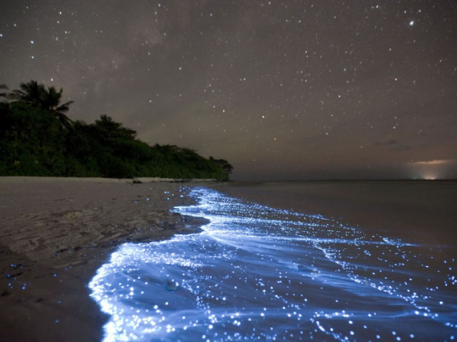 별의 바다라고 불리는 몰디브의 바드후 섬의 해변은 마치 별이 내려앉은 것처럼 아름다운 경관을 자랑한다. 물속의 플랑크톤들이 파도가 일거나 물과 충돌하면서 물리적인 충격을 받았을 때 해수 중의 산소와 반응하여 불빛을 만들어내는 ‘bio-luminescence’ 자연 현상 덕분에 아름다운 해변이 생겨났다. 낮에는 평범한 해변이지만 해가 지면 식물성 플랑크톤들이 빛을 내며 몰려들기 때문에 은하수 같은 풍경이 펼쳐진다. 눈부시게 아름다운 별의 바다에서 서핑을 즐기려는 서퍼들이 이곳을 자주 찾는다.