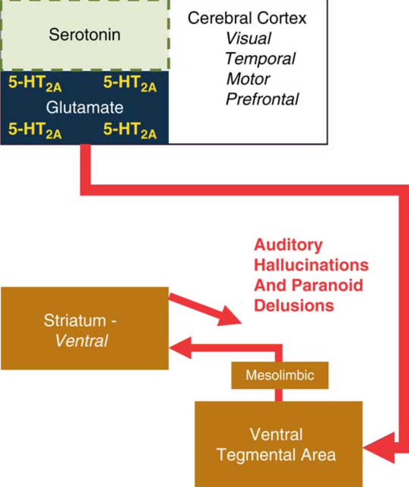 Figure 3 Psychosis can be the result of hyperactivation of 5-HT 2A receptors on glutamate neurons. This hyperactivation may be due to excess serotonin, upregulated 5-HT2A receptors, or a psychedelic hallucinogenic 5-HT 2A agonist, all of which could lead to downstream release of glutamate. Glutamate release in the VTA may activate the mesolimbic pathway, resulting in excess dopamine in the ventral striatum.