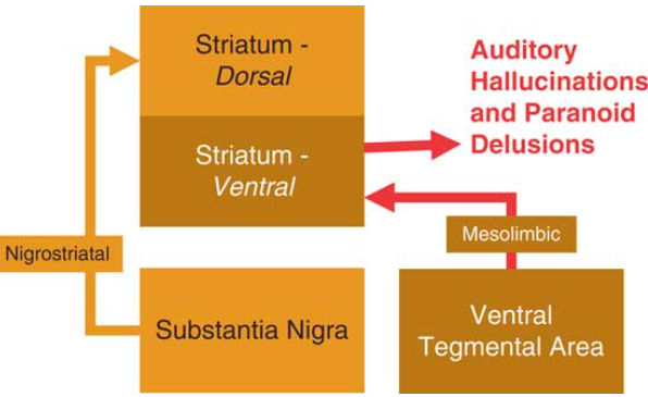 Figure 1 The dopamine hypothesis of psychosis. For half a century, psychosis, particularly auditory hallucinations and paranoid delusions, have been thought to be the result of hyperactivation of the dopaminergic mesolimbic pathway. The mesolimbic pathway projects from the ventral tegmental area (VTA) to the ventral striatum. The dorsal striatum is not thought to be affected by this hyperactivity because it is innervated via the nigrostriatal pathway from the substantia nigra and controls motor movements.