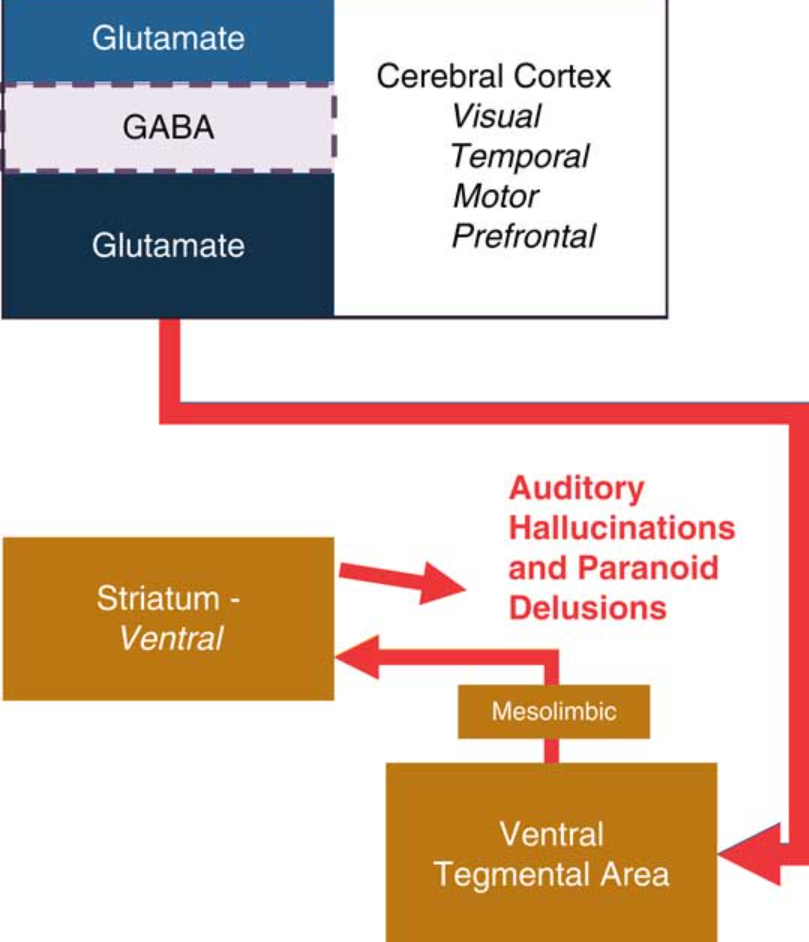 Figure 2 A recent theory suggests that psychosis in schizophrenia may be the result of hypofunctional NMDA receptors on GABA interneurons in the cerebral cortex This hypofunction may lead to overactivation of downstream glutamate signaling to the ventral tegmental area. Overactivation of this pathway may result in turn in excess dopamine in the ventral striatum via the mesolimbic pathway.